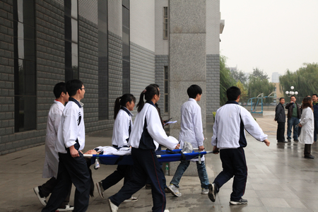 上午10点30分,疏散逃生演练正式开始。保卫科组成疏散演练指挥小组,演练假设博学楼九楼报告厅不慎发生火灾,火势猛烈,浓烟滚滚。演练总指挥一声令下,报告厅老师、学生们纷纷拿起了自备的湿毛巾,捂着鼻子,俯着身子,在辅导员和疏散员的指引下,快速有序地靠墙一侧下楼,逃离危险区域。迅速赶到火灾现场的医务人员,带领学生把虚拟伤员用担架以最快的速度抬离至安全地带进行抢救。仅用不到五分钟的时间,全体师生已在楼下集合完毕,各班辅导员向总指挥汇报清点人数和疏散情况。演练全过程,师生行动迅速,出色地完成了本次演习任务。
