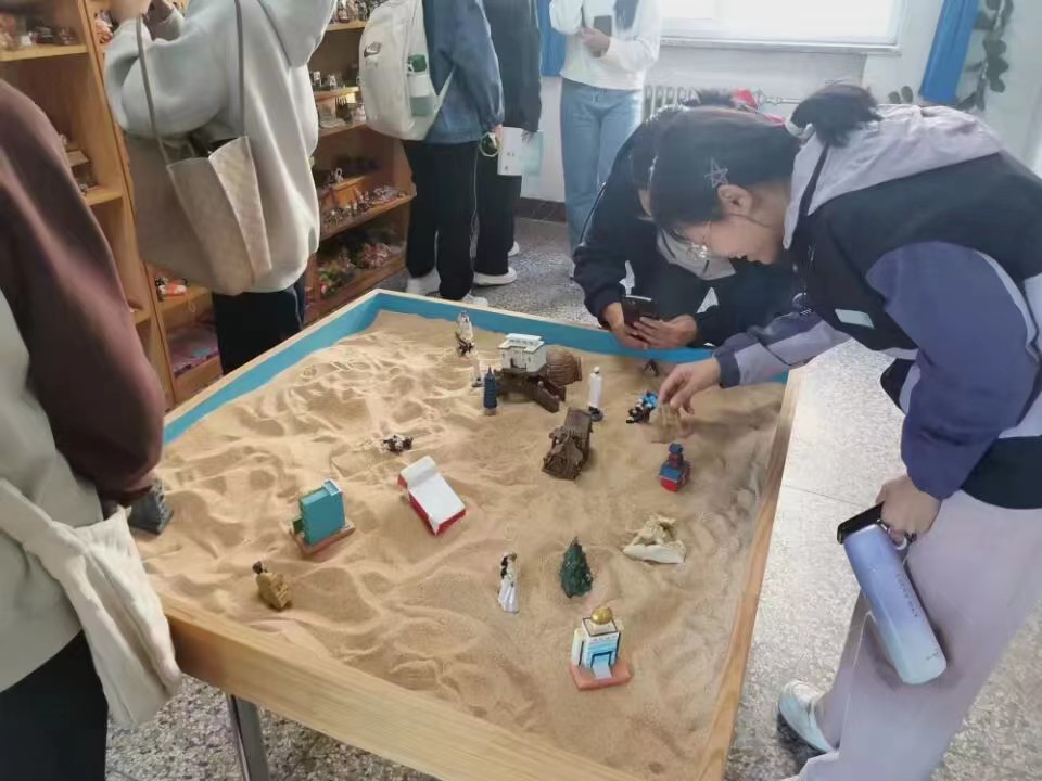 新生们依次参观了预约室、音乐放松室、个体咨询室、三味书屋、心理宣泄室、沙盘游戏室。在音乐放松室,新奇的音乐按摩椅吸引了同学们的眼球,许多同学坐上按摩椅体验音乐疗养,安静舒适的环境令人十分惬意。来到心理宣泄室,有同学戴上手套体验情感发泄的感觉,现场十分热闹。在沙盘游戏室,工作人员介绍了不同类型的沙盘模具,采用目前国际上很流行的心理治疗方法心理映射技术,让同学们尝试着摆放模型,动手体验。借助沙盘唤起童心,将心中的图画构建在沙盘上,以此来表达自己,显示内心世界。