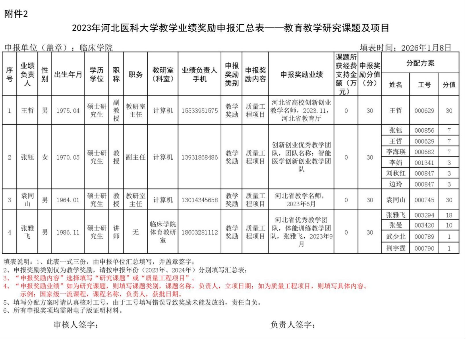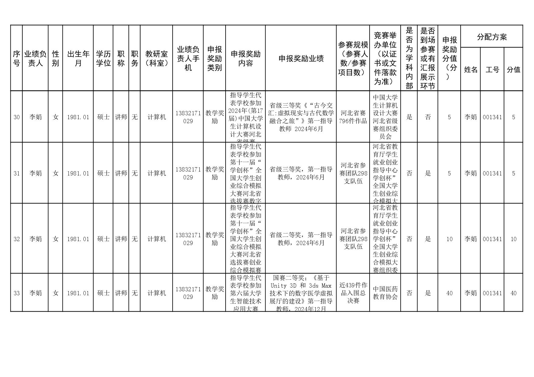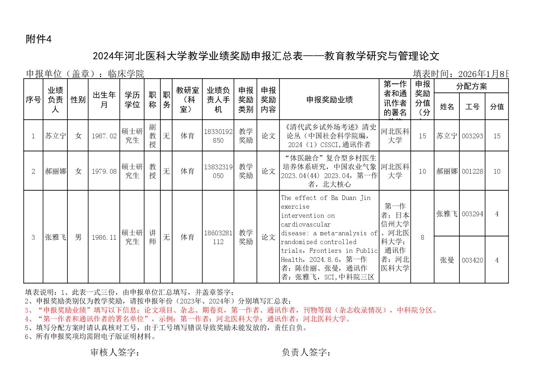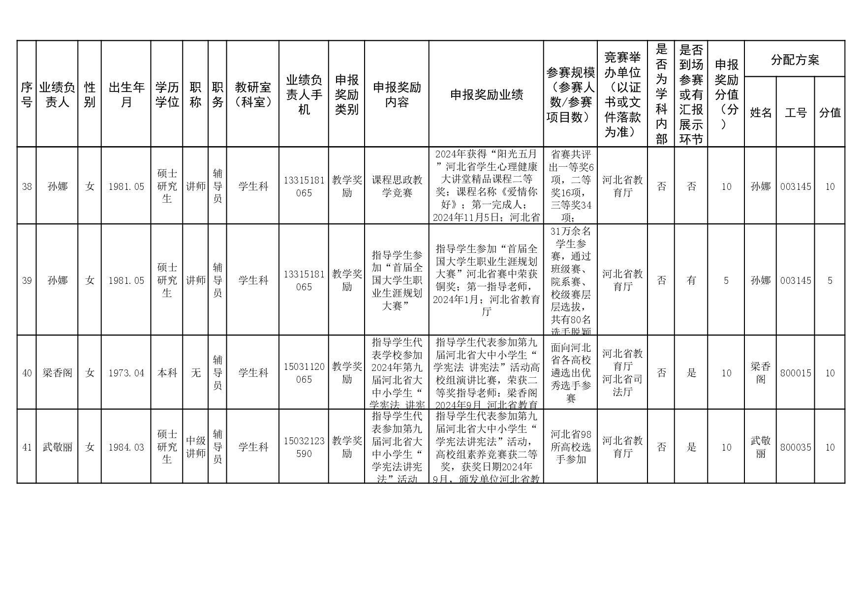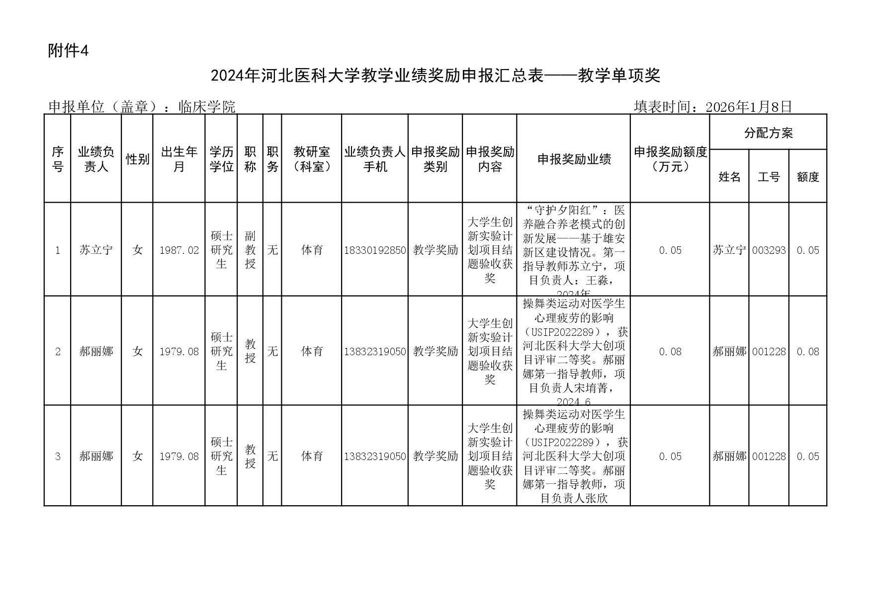 根据《51视频 关于申报2023、2024年度教学业绩奖励的通知》要求,经个人申报、教研室汇总、教务科初审,现将51视频 2023年和2024年教学业绩奖励申报情况进行公示,公示截止时间为2026年1月12日下午6点,在此期间,如对申报情况有异议,请与教务科联系,电话:0311-86265817、13473955641,逾期不再处理。