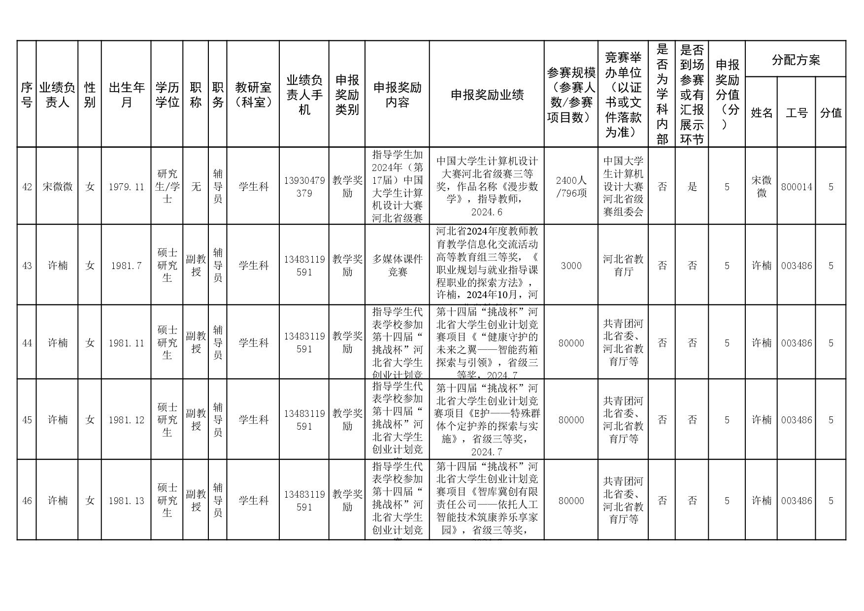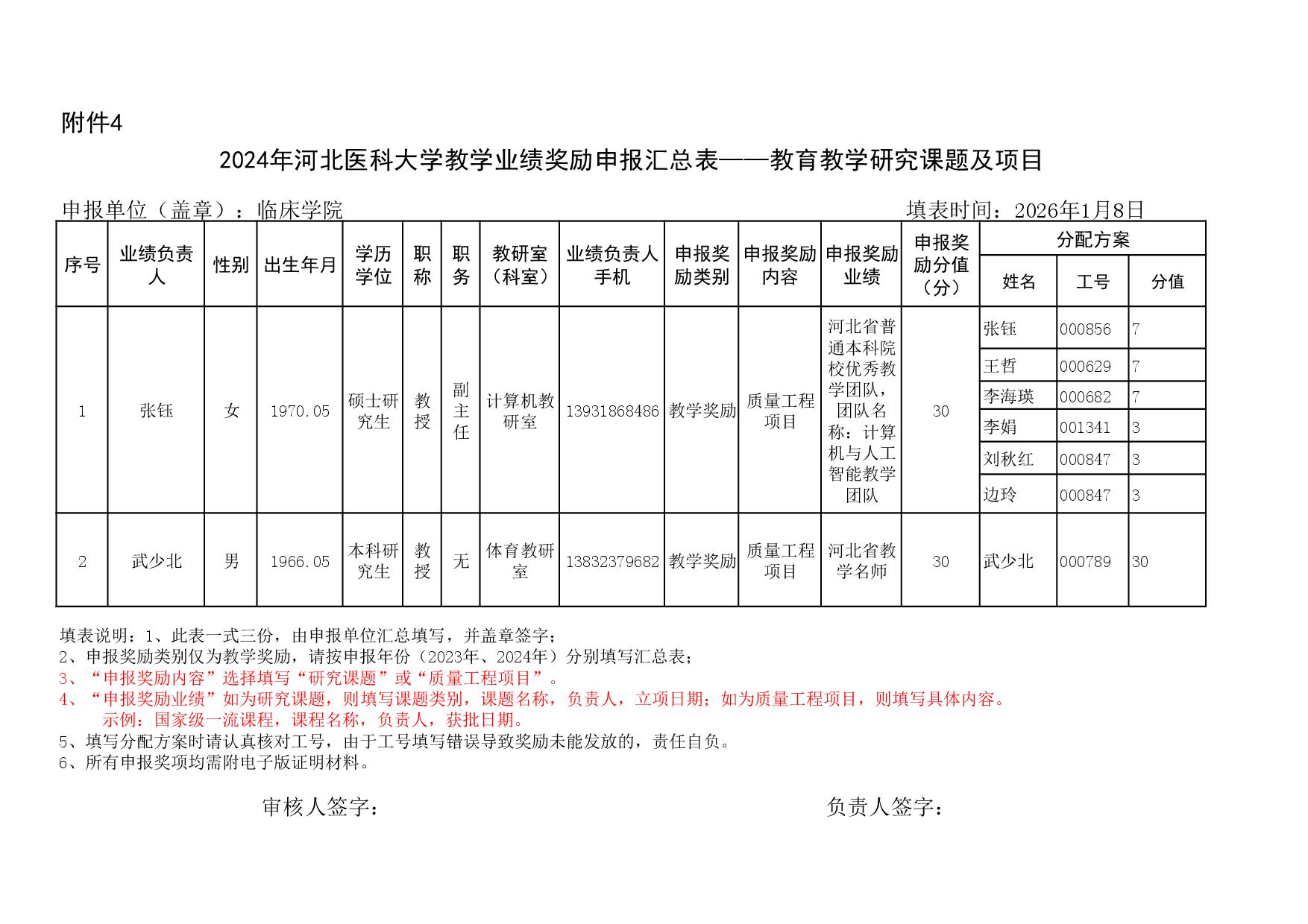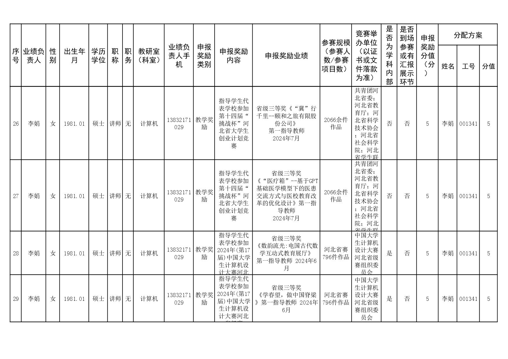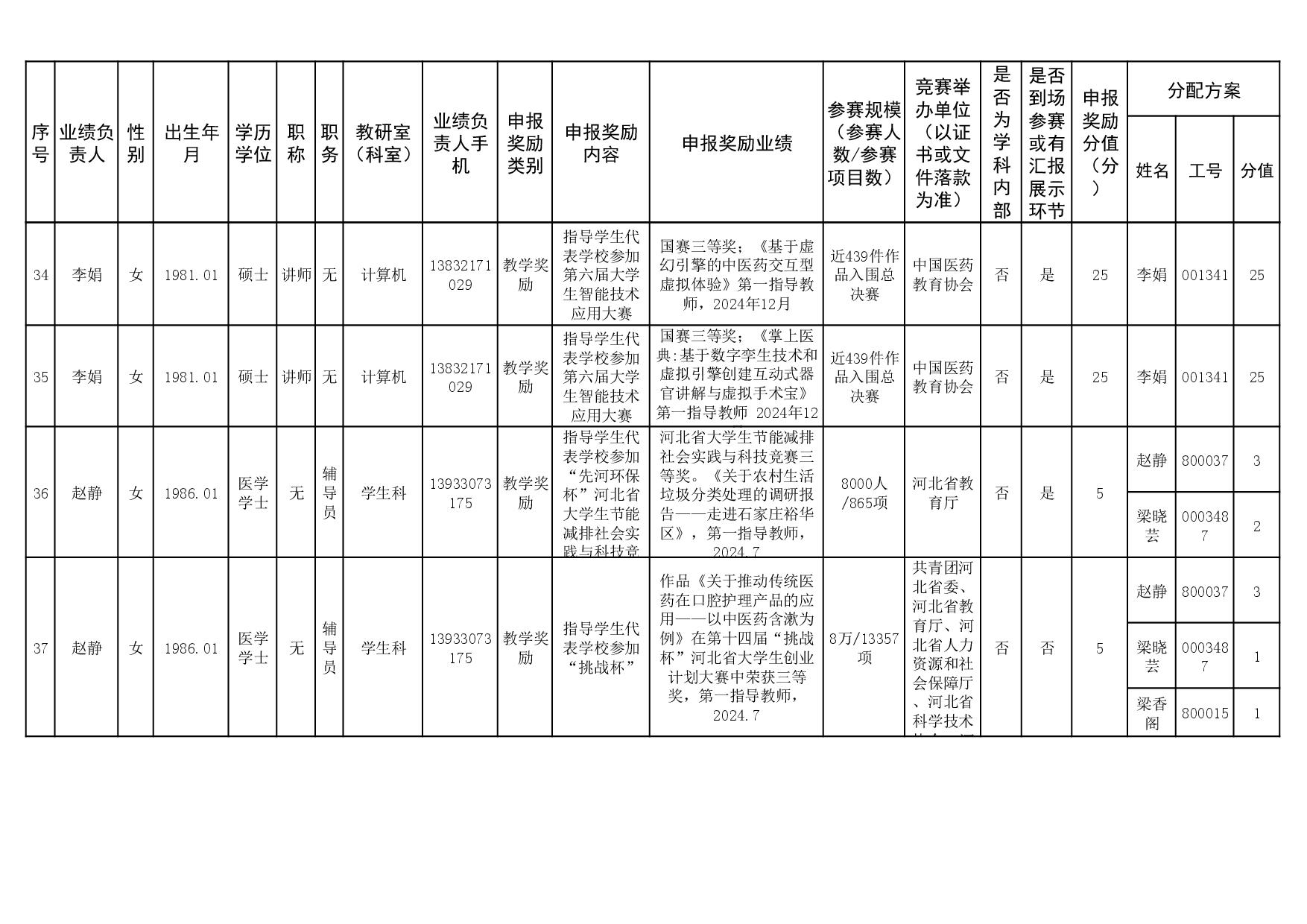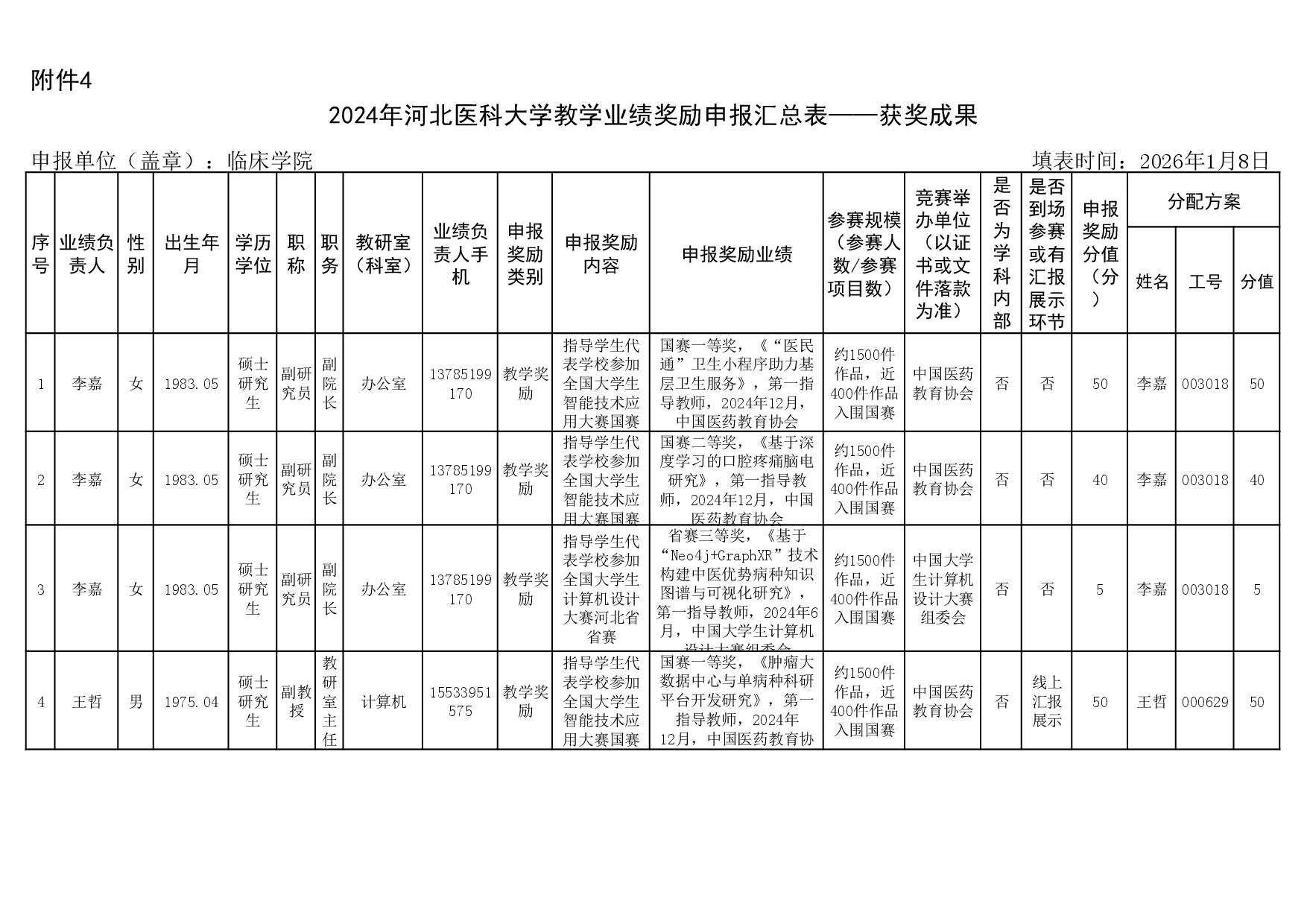 根据《51视频 关于申报2023、2024年度教学业绩奖励的通知》要求,经个人申报、教研室汇总、教务科初审,现将51视频 2023年和2024年教学业绩奖励申报情况进行公示,公示截止时间为2026年1月12日下午6点,在此期间,如对申报情况有异议,请与教务科联系,电话:0311-86265817、13473955641,逾期不再处理。