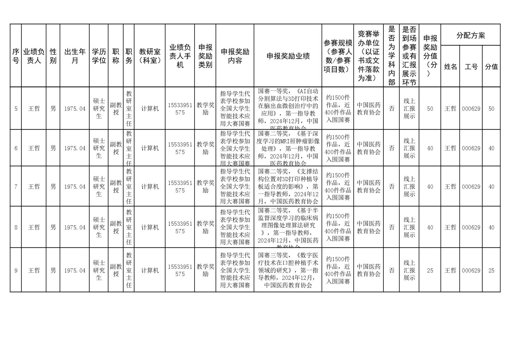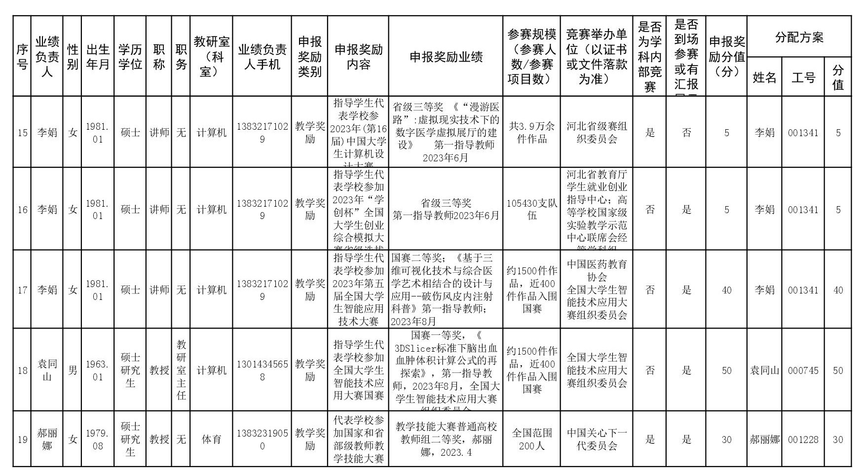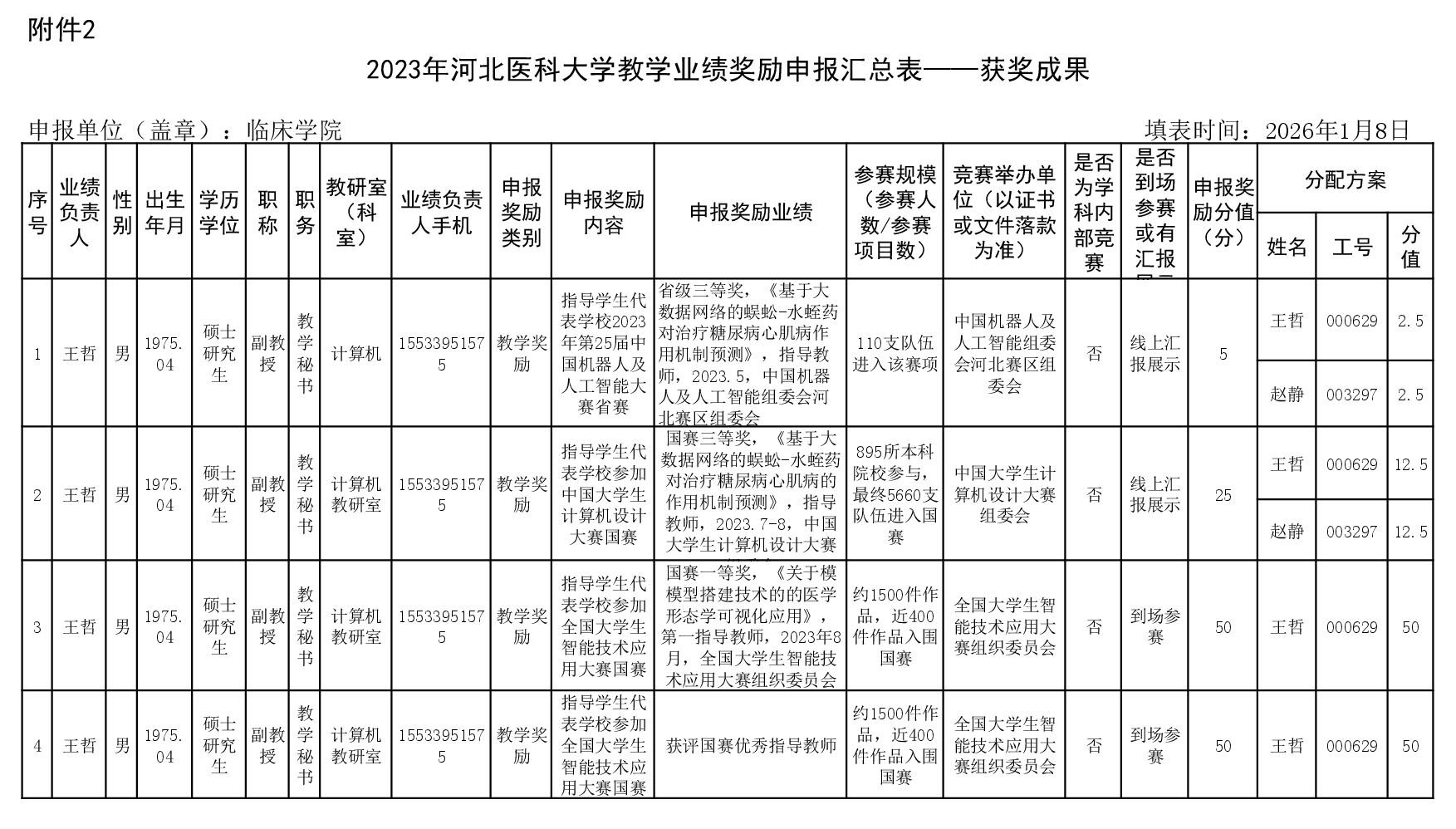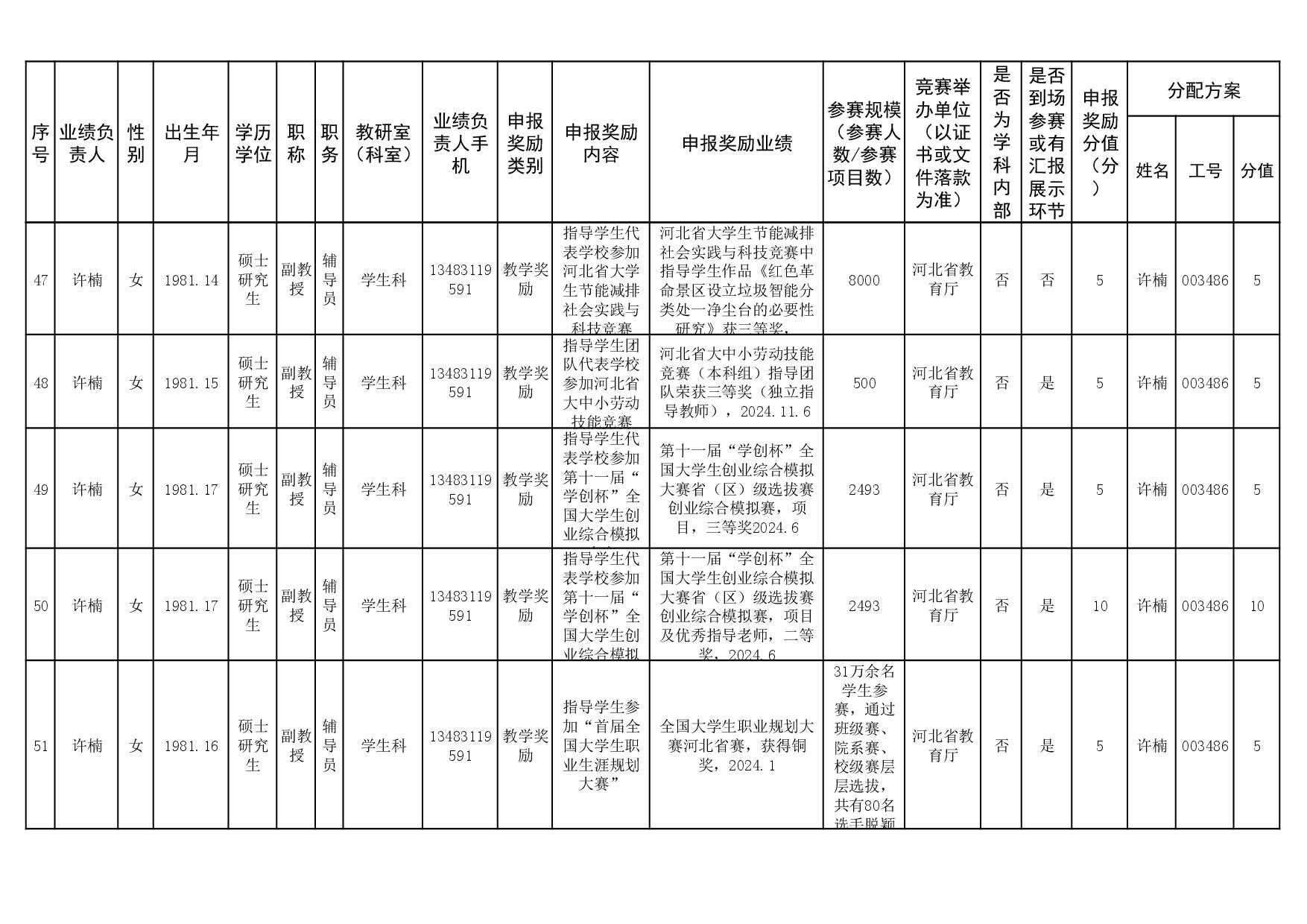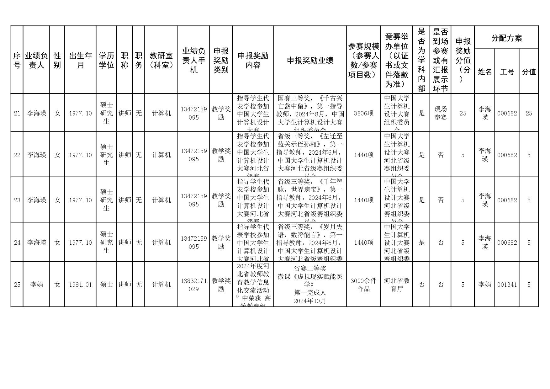 根据《51视频 关于申报2023、2024年度教学业绩奖励的通知》要求,经个人申报、教研室汇总、教务科初审,现将51视频 2023年和2024年教学业绩奖励申报情况进行公示,公示截止时间为2026年1月12日下午6点,在此期间,如对申报情况有异议,请与教务科联系,电话:0311-86265817、13473955641,逾期不再处理。
