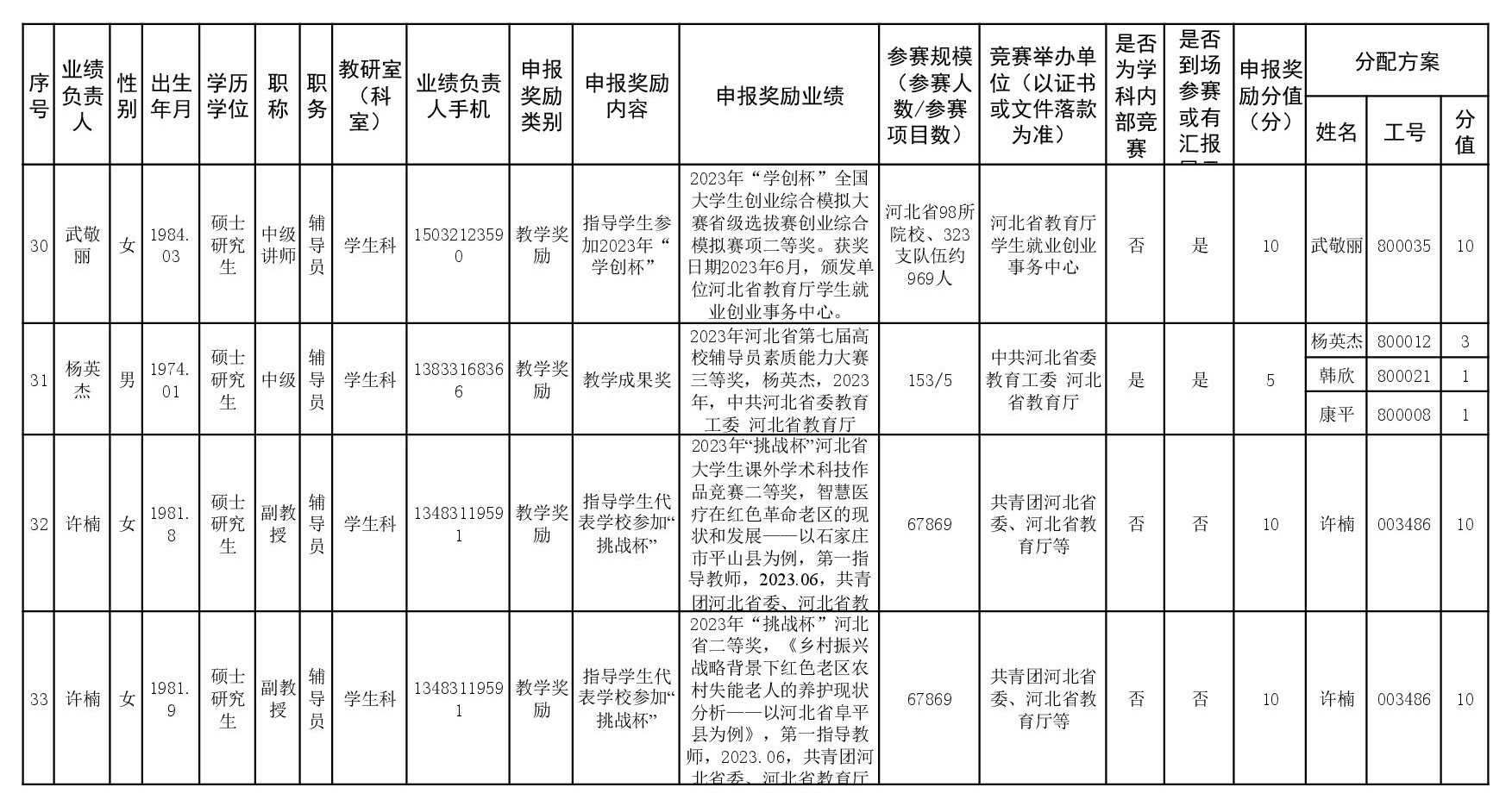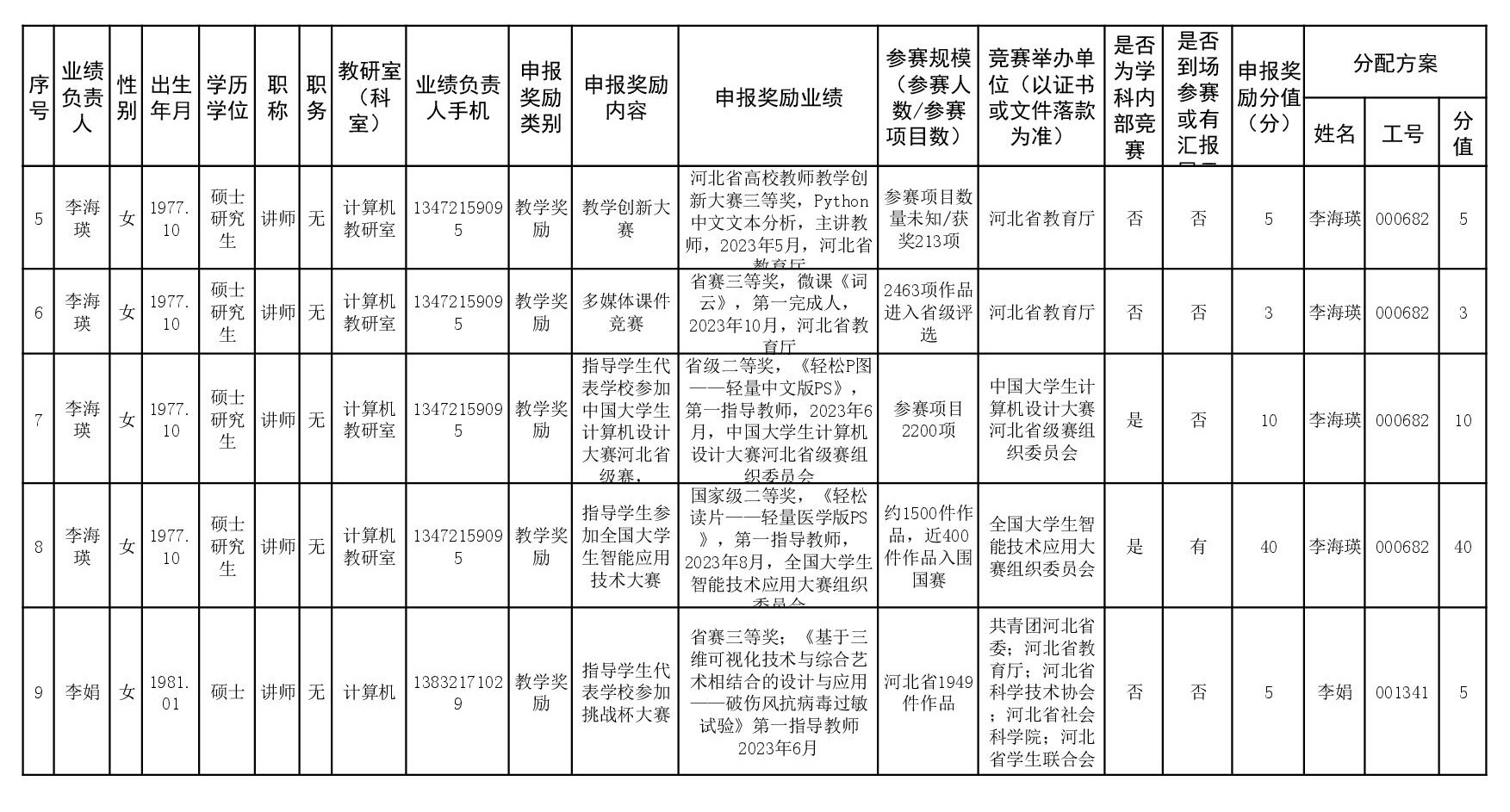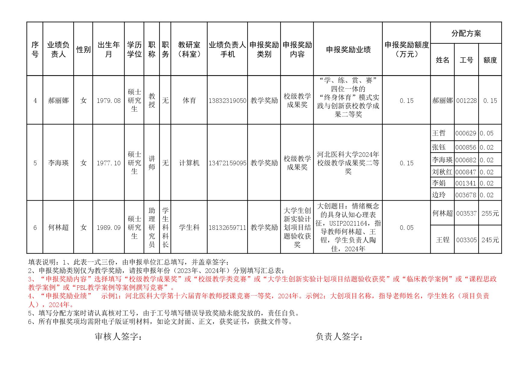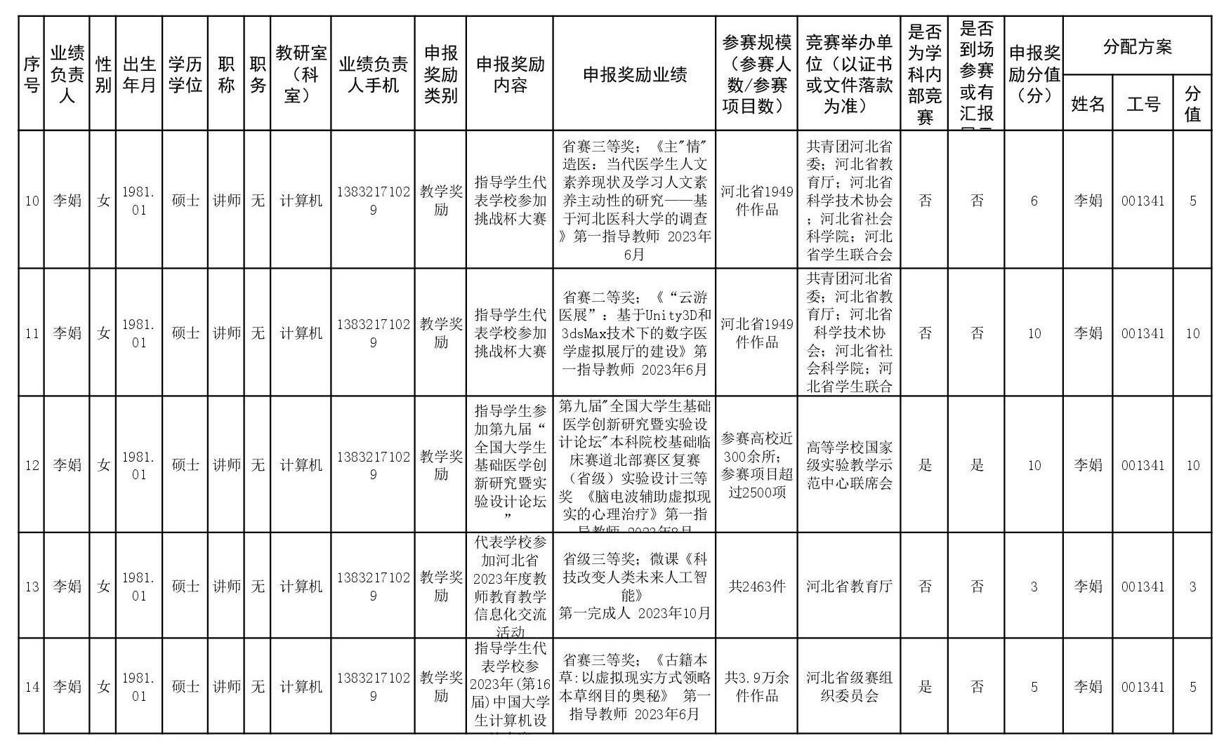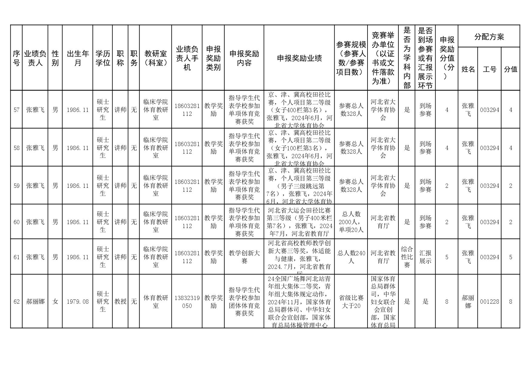 根据《51视频 关于申报2023、2024年度教学业绩奖励的通知》要求,经个人申报、教研室汇总、教务科初审,现将51视频 2023年和2024年教学业绩奖励申报情况进行公示,公示截止时间为2026年1月12日下午6点,在此期间,如对申报情况有异议,请与教务科联系,电话:0311-86265817、13473955641,逾期不再处理。